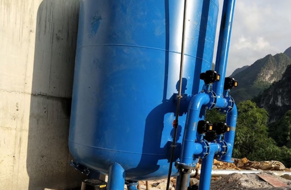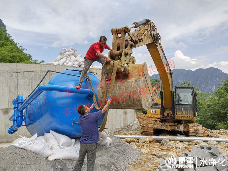 项目名称:百色市凌云县伶站瑶族乡40吨压力式一体化净水设备 设备名称:40吨压力式一体化净水设备 工艺流程:河水-絮凝加药-石英砂过滤器-二氧化氯加药器-净水箱-各用水点...