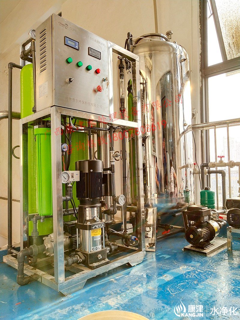 工艺流程:原水箱-原水泵-石英砂过滤器-活性炭过滤器-精密过滤器-反渗透设备-净水箱-变频供水-各点用水