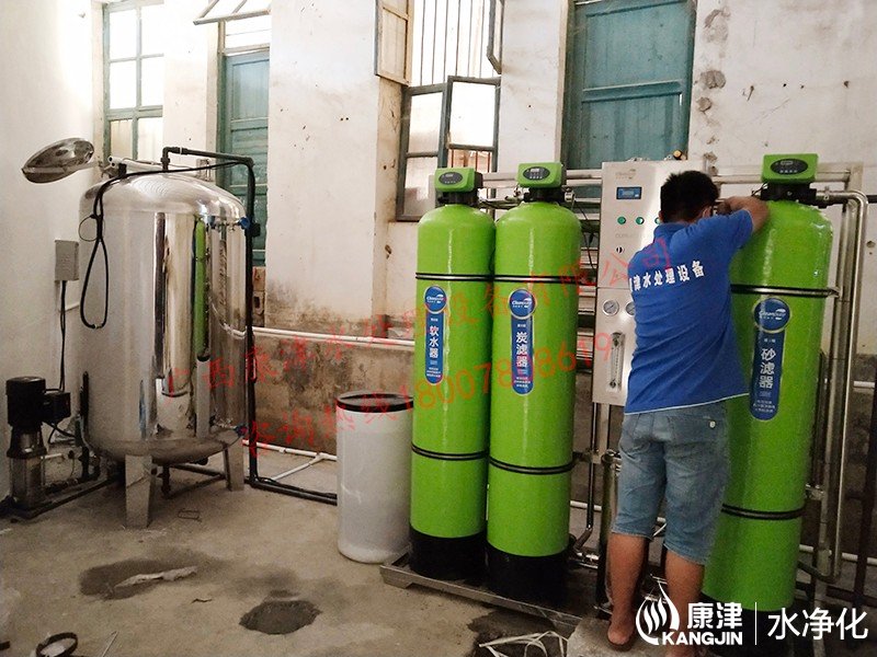工艺流程:原水箱-原水泵-石英砂过滤器-活性炭过滤器-软水器-精密过滤器-反渗透设备-净水箱-变频供水-管线机